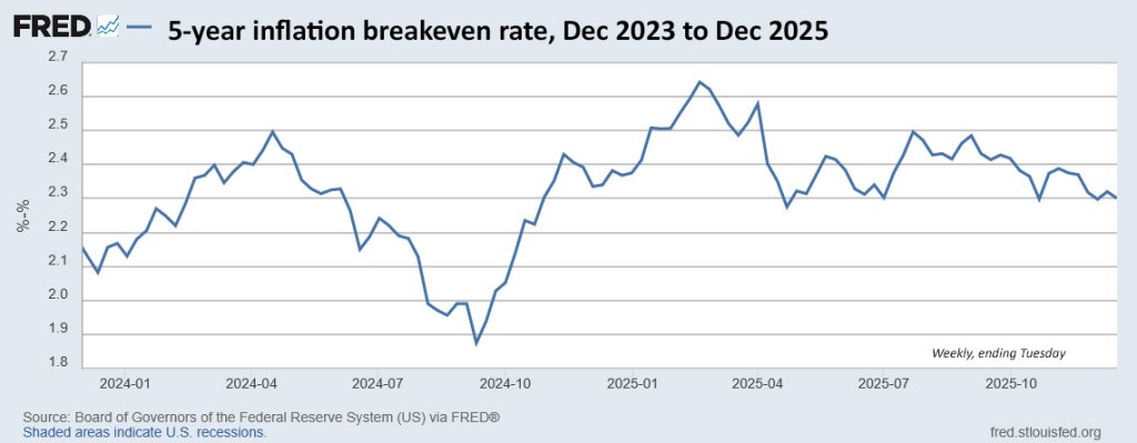 Here is the trend in the 5-year inflation breakeven rate over the last two years. Note that today’s result of 2.25% fell a bit below recent trends. The data for this chart was through Tuesday: