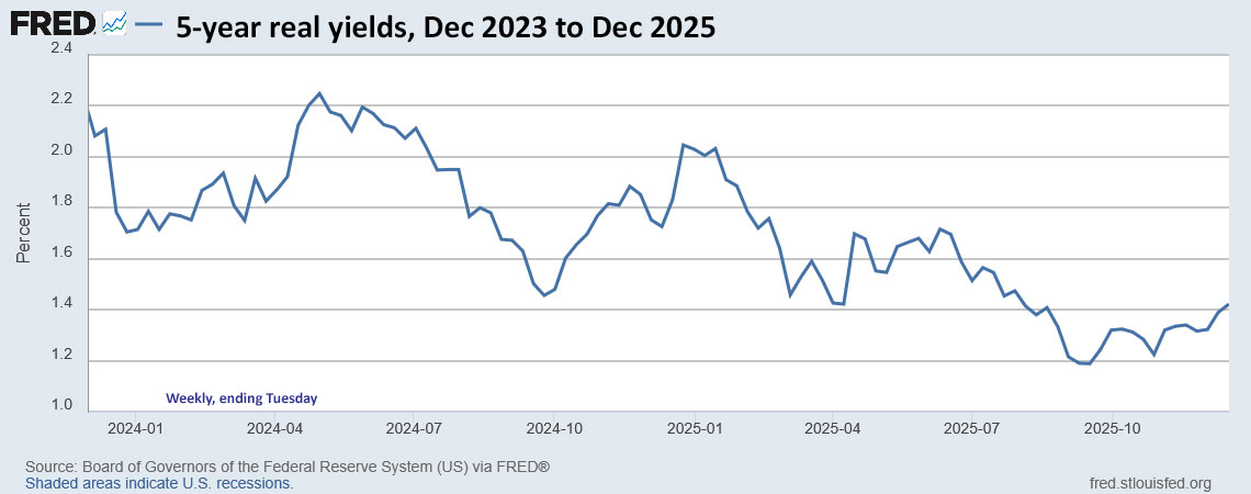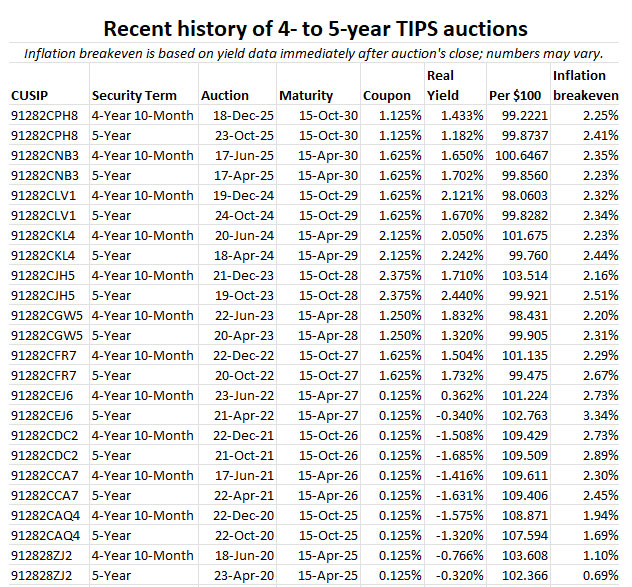Here are results of recent TIPS auctions in the 4- to 5-year term. Note that just four years ago, a similar December reopening got a real yield of -1.508%. Things have changed for the better for TIPS investors: