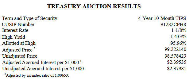 The Treasury’s offering of $24 billion in a reopened 5-year TIPS — CUSIP 91282CPH8 — generated a real yield to maturity of 1.433% to strong demand from investors.