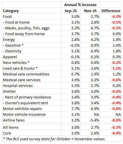Because we got no month-to-month data for October and November, I decided to look at look at changes in September to November annual price increases for major consumer categories. It’s about the only indication we have to determine — in theory — where inflation is declining or rising.