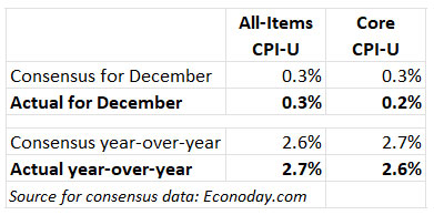 U.S. inflation rose 0.3% on a seasonally adjusted basis in December, the Bureau of Labor Statistics reported today, with annual inflation holding steady at 2.7%, same as reported for November.