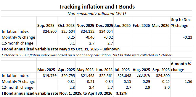For I Bonds. The December report is the third of a six-month string that will determine the I Bond’s new variable rate, to be reset May 1. Inflation in the months of October to December has declined 0.23%, which at this point would result in a variable rate of -0.46%. However, this trend will likely reverse (possibly strongly) in January to March. So it’s too early to focus on the likely variable rate.
