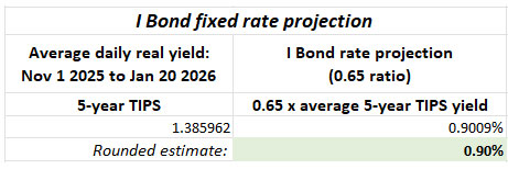 At this point, the projection points to the I Bond fixed rate remaining at 0.90% at the May reset. But a lot can change in the next three months, especially if the Federal Reserve moves to cut short-term interest rates in the meantime.
