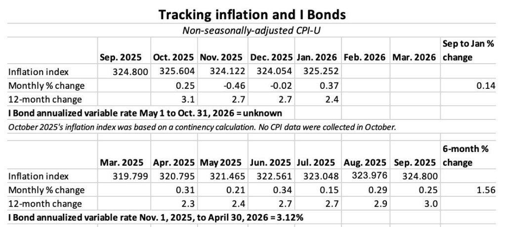 For I Bonds. January was the fourth month of a six-month string that will determine the I Bond’s new variable rate, which will be reset on May 1. At this point, four months in, inflation has increased only 0.14%, which would translate to a variable rate of 0.28%. Most likely we will be getting a new variable rate of about 1.4%, down from the current 3.12%. But a lot of things can change in the next two months.