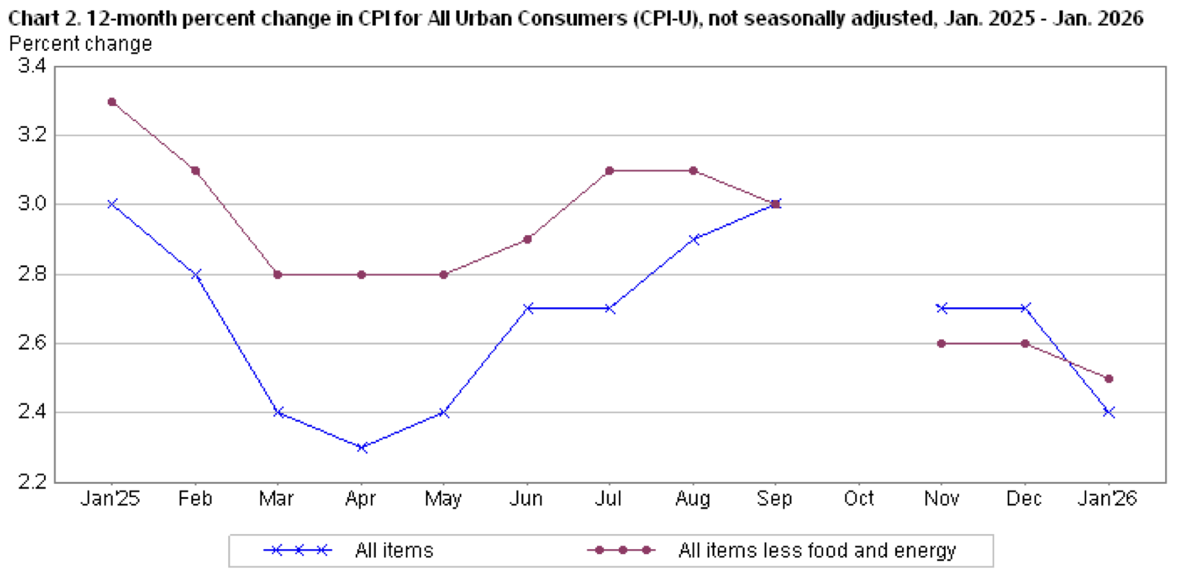 The Bureau of Labor Statistics reported Thursday that headline CPI increased 0.2% in January, less than the expected rate of 0.3%. Annual inflation dipped from 2.7% in December to 2.4%, the lowest annual number since May 2025.