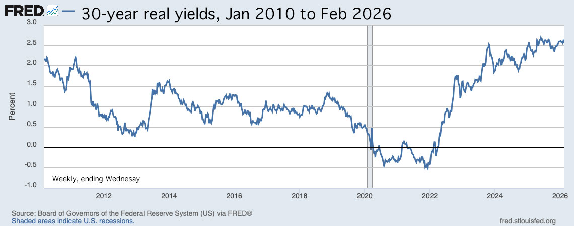 That’s a fairly high breakeven rate, but consistent with recent trends. Inflation over the last 30 years, ending in January, has averaged 2.5%.