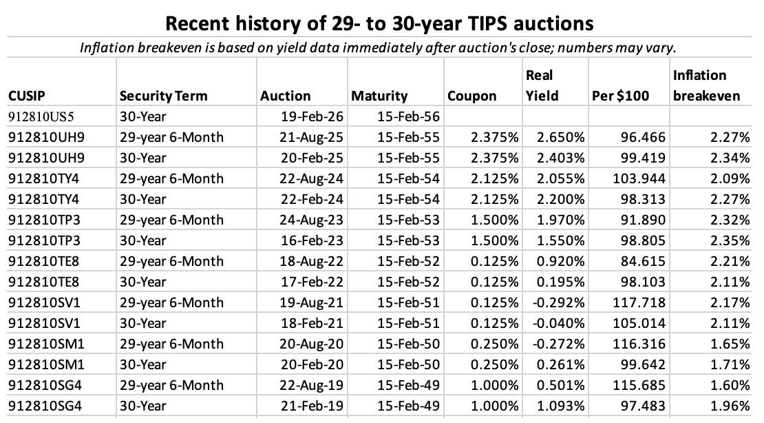The Treasury on Thursday will offer $9 billion in a new 30-year Treasury Inflation-Protected Security, CUSIP 912810US5. The real yield to maturity and coupon rate will be determined by the auction results, but it looks likely this TIPS will get an attractive real yield, possibly close to 2.5%.