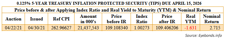 So I was intrigued (more out of boredom than financial sense) by the Treasury’s auction on April 22, 2021 of a new 5-year Treasury Inflation-Protected Security, CUSIP 91282CCA7. At the time, I was interested in “nibbling” into TIPS auctions after a long spell on the sidelines.