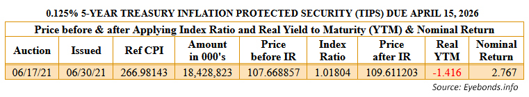 If you purchased an I Bond in April 2021, it had a fixed rate of 0.0%, much more attractive than the auctioned yield of -1.631% for this TIPS. By April 2026, the value of the I Bond had increased 24%, for an annual return of about 4.3% — easily exceeding the 2.7% for the TIPS or 0.8% for the nominal 5-year Treasury at the time. (Source: Eyebonds.info).