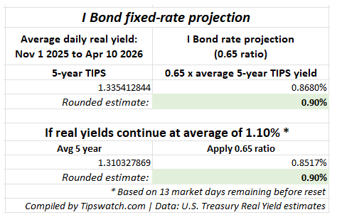 If we assume the fixed rate holds at 0.90% and the variable rate rises to 3.34%, we are looking at a new composite rate of 4.26%, up from the current 4.03%, for I Bonds purchased from May to October 2026. This is based on the formula the Treasury uses to calculate the composite rate: