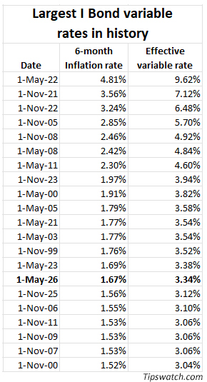 - The inflation-adjusted rate (often called the I Bond’s variable rate) changes each six months to reflect the running rate of inflation. That rate is currently 3.12%, annualized, for six months. It will adjust again on May 1, 2026, rolling into effect for all I Bonds, no matter when they were purchased.