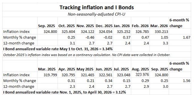 This is set in stone: Because of March’s lofty inflation, the I Bond’s inflation-adjusted variable rate will rise from the current 3.12% to a new rate of 3.34%. This is based on non-seasonally adjusted inflation for the months of October 2025 to March 2026, an increase of 1.67%. The I Bond’s rate-setting formula doubles the six-month inflation rate to create the new variable rate.