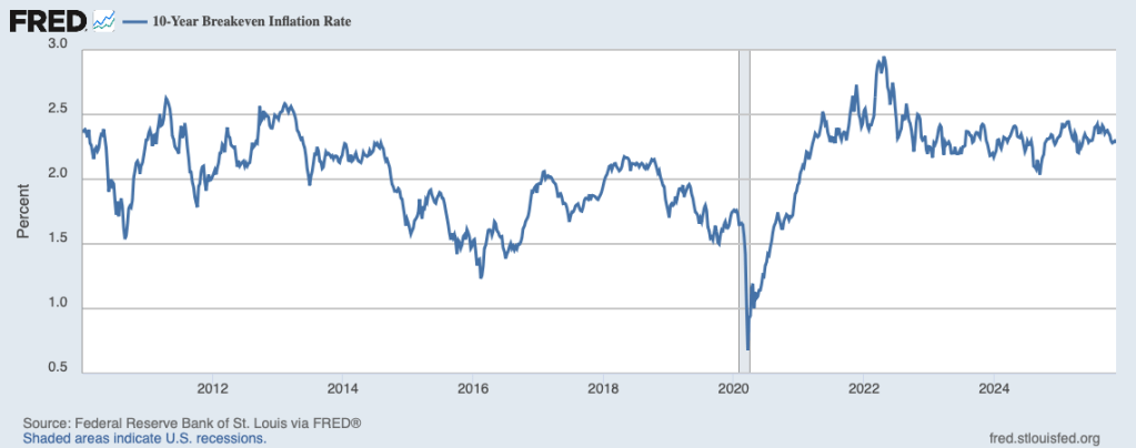 Here is the history of the 10-year inflation breakeven rate over the last 15 years, showing that inflation expectations have been holding well above 2.0% since the summer of 2021: