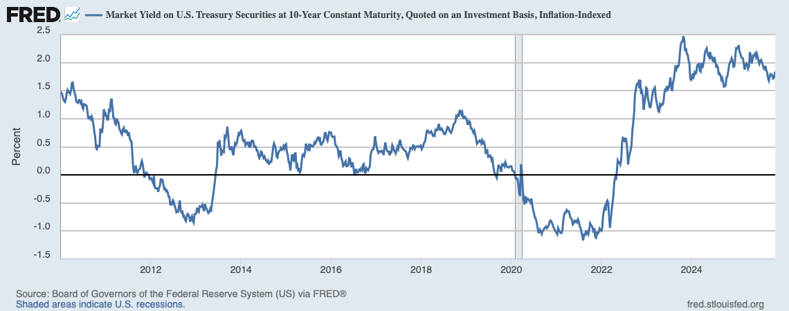CUSIP 91282CNS6 had an originating auction on July 24, 2025, which generated a real yield to maturity of 1.985% and a coupon rate at 1.875%. Since then, real yields have declined a bit. This TIPS closed Friday on the secondary market with a real yield of 1.83%.