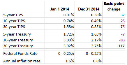 Even though real and nominal interest rates declined in 2014 — reversing the overreaction of 2013 — this wasn’t a good year for TIPS and TIPS funds. Why? Because the yield curve began flattening (with shorter-term yields rising and longer-term yields falling) and inflation slumped to 0.8% year-over-year. Here are the 2014 statistics: