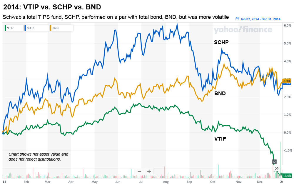 BND was the winner in 2014. SCHP took a volatile course toward a fairly good year. VTIP was the loser.