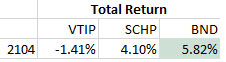 But the chart is a bit misleading, because it does not include distributions. When you look at total return, BND (the total bond market) outperformed both VTIP and SCHP because inflation adjustments couldn’t match the higher nominal yields of the total bond market.