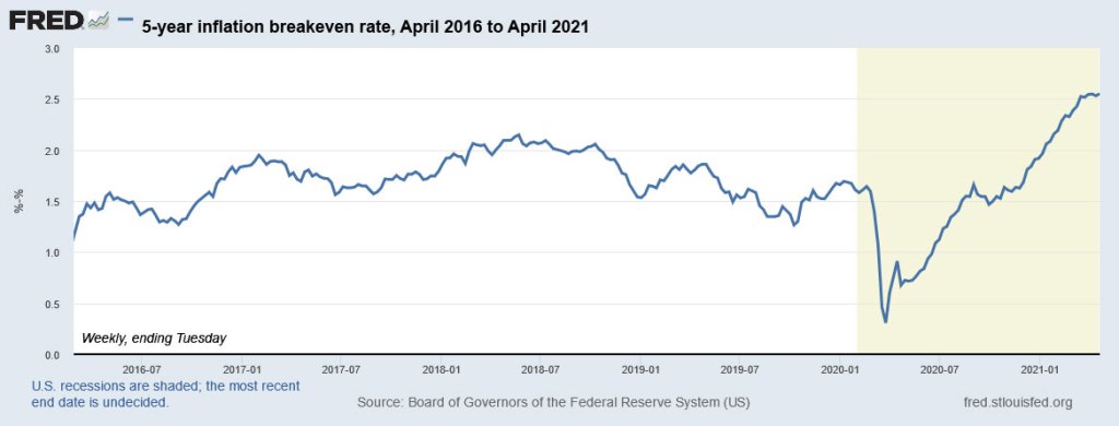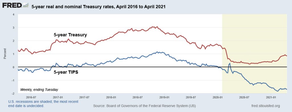Here are the fixed rate versus TIPS yields going back to 2008. As an interesting aside, notice that the 10-year TIPS yield has risen 6 basis points over the last year, while the 5-year TIPS yield has shot 50-basis-points lower.