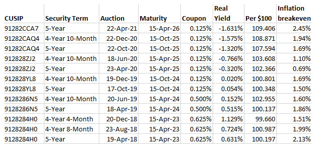 Here are the fixed rate versus TIPS yields going back to 2008. As an interesting aside, notice that the 10-year TIPS yield has risen 6 basis points over the last year, while the 5-year TIPS yield has shot 50-basis-points lower.