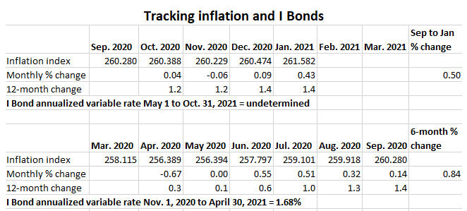 For I Bonds. The February report was the fifth in a six-month series that will set the future inflation-adjusted variable rate for U.S. Series I Savings Bonds. At this point, five months in, inflation has increased 1.05%, which translates to an annualized variable rate of 2.10%, higher than the current rate of 1.68%. Because gasoline prices are continuing to rise in March, we should see that variable rate climb even higher. But … inflation is highly unpredictable.